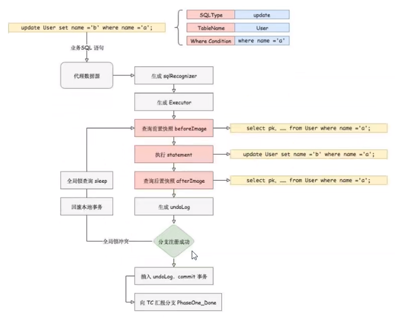 回滚方式便是用"before image"还原业务数据;但在还原前要首先要校验脏写,对比“数据库当前业务数据”和"after image"。