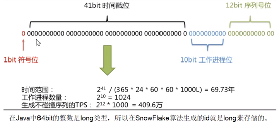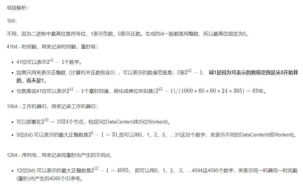 * 得到的值),这里的的开始时间戳,一般是我们的id生成器开始使用的时间,由我们程序来指定的(如下面程序SnowflakeIdWorker类的startTime属性)。41位的时间戳,可以使用69年,年T = (1L << 41) / (1000L * 60 * 60 * 24 * 365) = 69