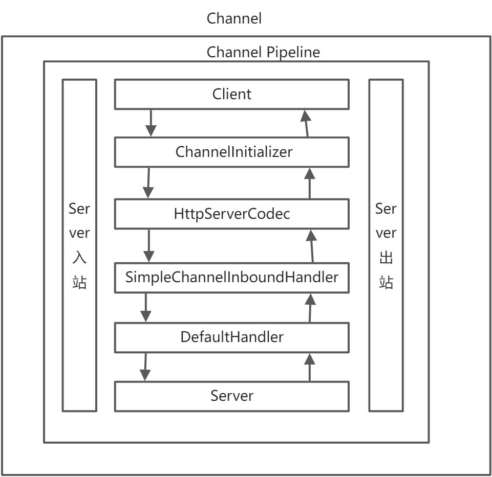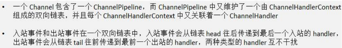 - ChannelPipeline是一个Handler的集合, 它负责处理和拦截inbound和outbound的事件和操作, 相当于一个贯穿Netty 的链. (也可以这样理解, ChannelPipeline是保存ChannelHandler的List, 用于处理或拦截Channel的入站事件和出站操作)