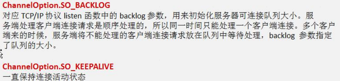 - Netty在创建Channel实例后, 一般都需要设置ChannelOption参数