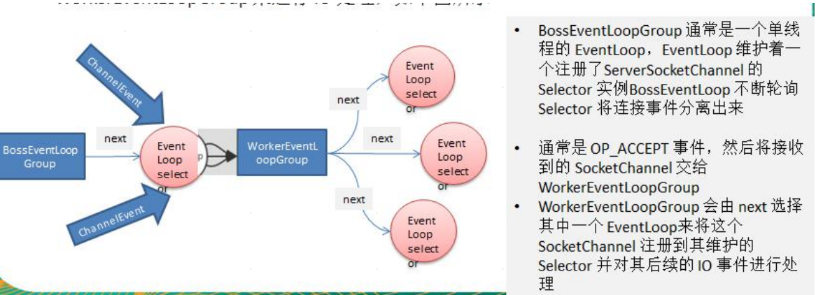 - EventLoopGroup提供next接口, 可以从组里面按照一定规则获取其中一个EventLoop来处理任务, 在Netty服务器端编程中, 我们一般都需要提供两个EventLoopGroup 例如:BossEventLoopGroup 和 WorkerEventLoopGroup