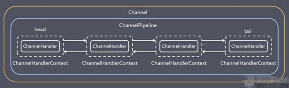 - 在Netty中每个Channel都有且仅有一个ChannelPipeline与之对应, 他们的组成关系如下