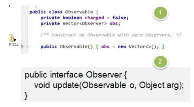 - Observable是类,不是接口,类中已经实现了核心的方法,即管理Observer的方法add..delete..notify...