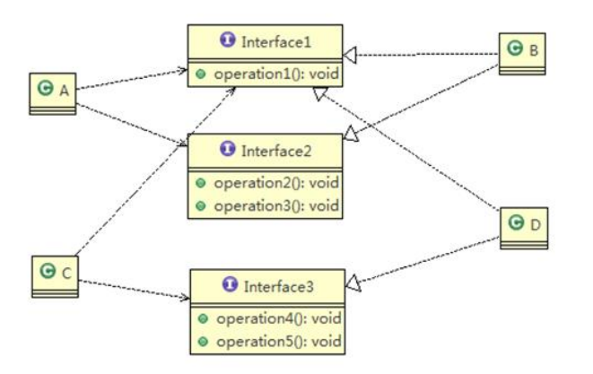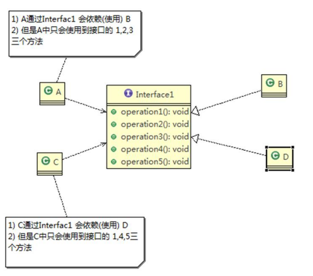 - 类A通过接口Interface1依赖类B, 类C通过Interface1依赖类D, 如果Interface1对于类A和类C来说不是最小接口,那么类B和类D必须去实现他们不需要的方法