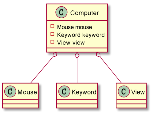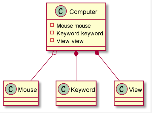 一台电脑由键盘, 显示器, 鼠标等部件组成; 组成电脑的各个配件是可以从电脑上分离出来的, 使用实线-空心菱形表示