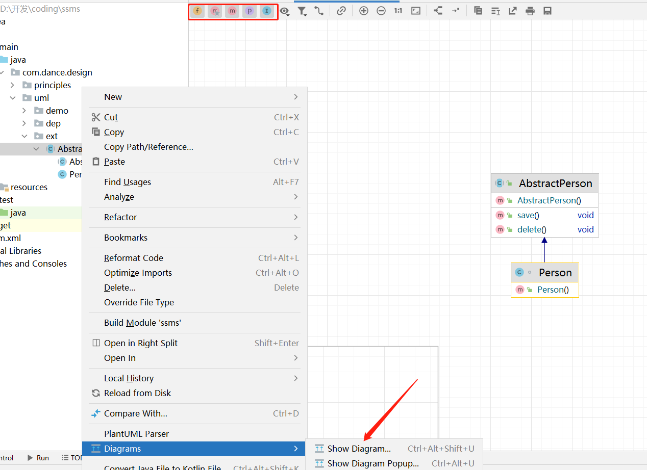 刚才在点击IDEA的时候发现IDEA其实默认是带了Diagrams这个类图插件的,这个也挺好用的直接就能显示,但是好像不能修改,但是可以控制方法,构造,接口这些是不是展示,感觉也挺好的, 有喜欢的可以去试试, 这里我们还是用PlantUML吧