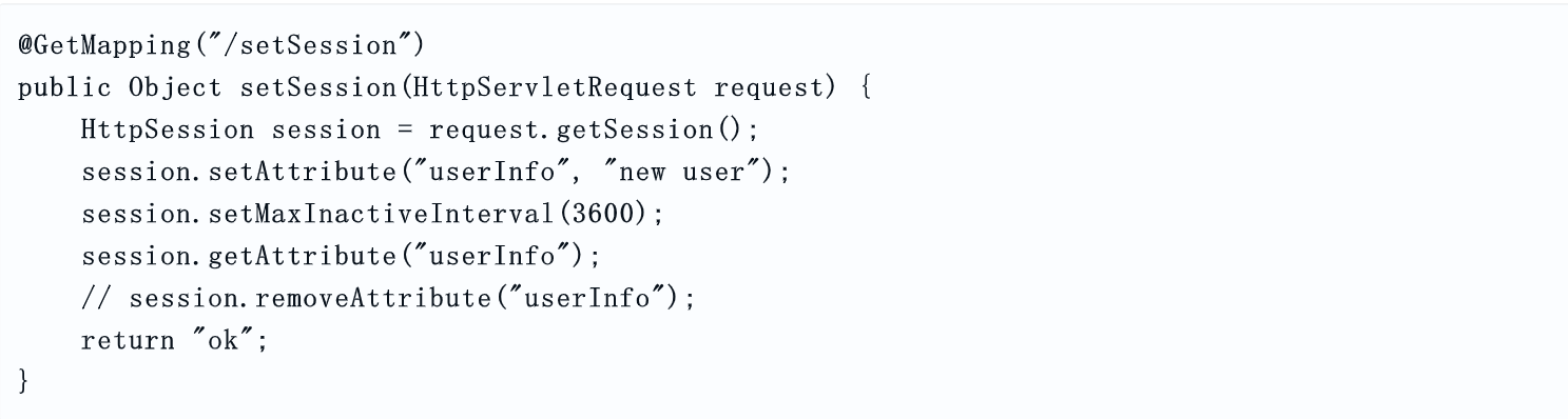 会话Session代表的是客户端与服务器的一次交互过程,这个过程可以是连续也可以是时断时续的。曾经的Servlet时代(jsp),一旦用户与服务端交互,服务器用户创建一个session,同时前端会有一个jsessionid,每次交互都会携带。如此一来,服务器只要在接到用户请求时候,就可以拿到jsessionid,并根据这个ID在对应的会话session,当拿到session会话后,那么我们就可以操作会话了。会话存活期间,我们就能认为用户一直处于正在使用着网站的状态,一旦session超期就可以认为用户已经离开网站,停止交互了。用户的身份信息,我们也是通过session来判断的,在session中可以保存不同用户的信息。session的使用之前在单体部分演示过,代码如下: