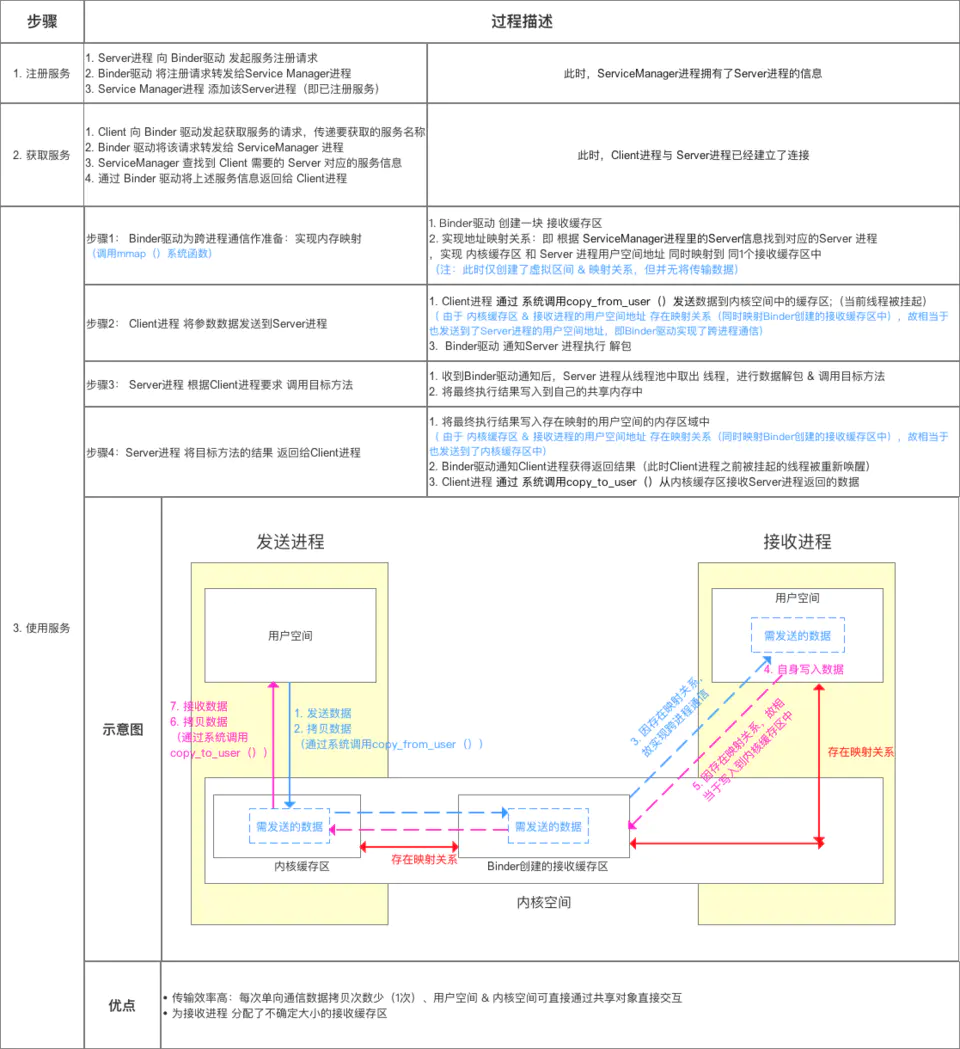 - 1、效率:传输效率主要影响因素是内存拷贝的次数,拷贝次数越少,传输速率越高。从Android进程架构角度分析:对于消息队列、Socket和管道来说,数据先从发送方的缓存区拷贝到内核开辟的缓存区中,再从内核缓存区拷贝到接收方的缓存区,一共两次拷贝,如图: