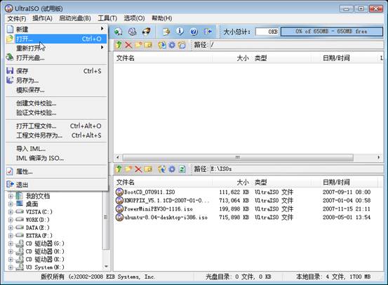2、 在主菜单选“文件”-〉“打开”,出现“打开ISO文件对话框”