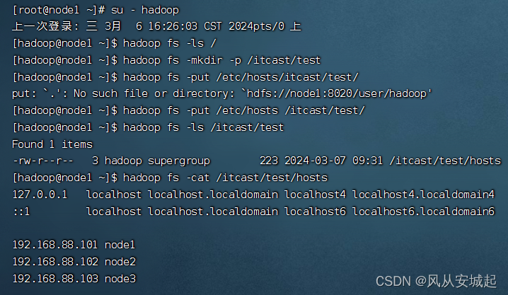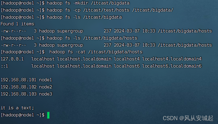 6.在hdfs中创建文件夹:/itcast/bigdata,将/itcast/test/hosts文件复制到/itcast/bigdata内