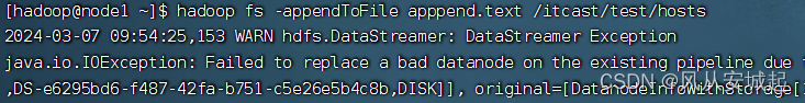 在站内搜索了一下发现好像是当一个DataNode写入失败时,为了保持DataNode的个数一致,会寻找其他的节点,继续写入,我总共只有三个DataNode节点,可以在hdfs-site.xml 文件中添加下面几行代码: