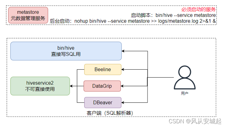 后台启动:nohup bin/hive --service metastore >> logs/metastore.log 2>&1 &
