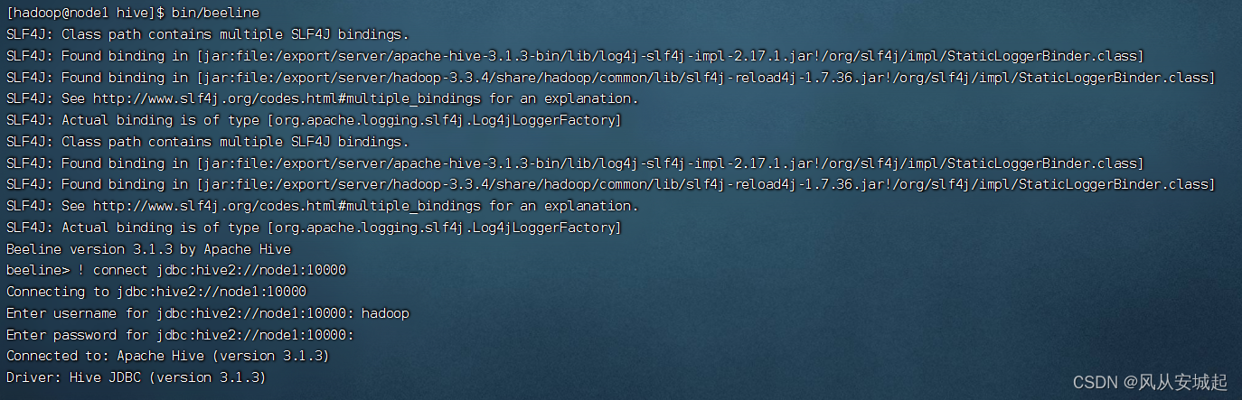 在node1上使用beeline客户端进行连接访问。需要注意hiveserver2服务启动之后需要稍等一会才可以对外提供服务。