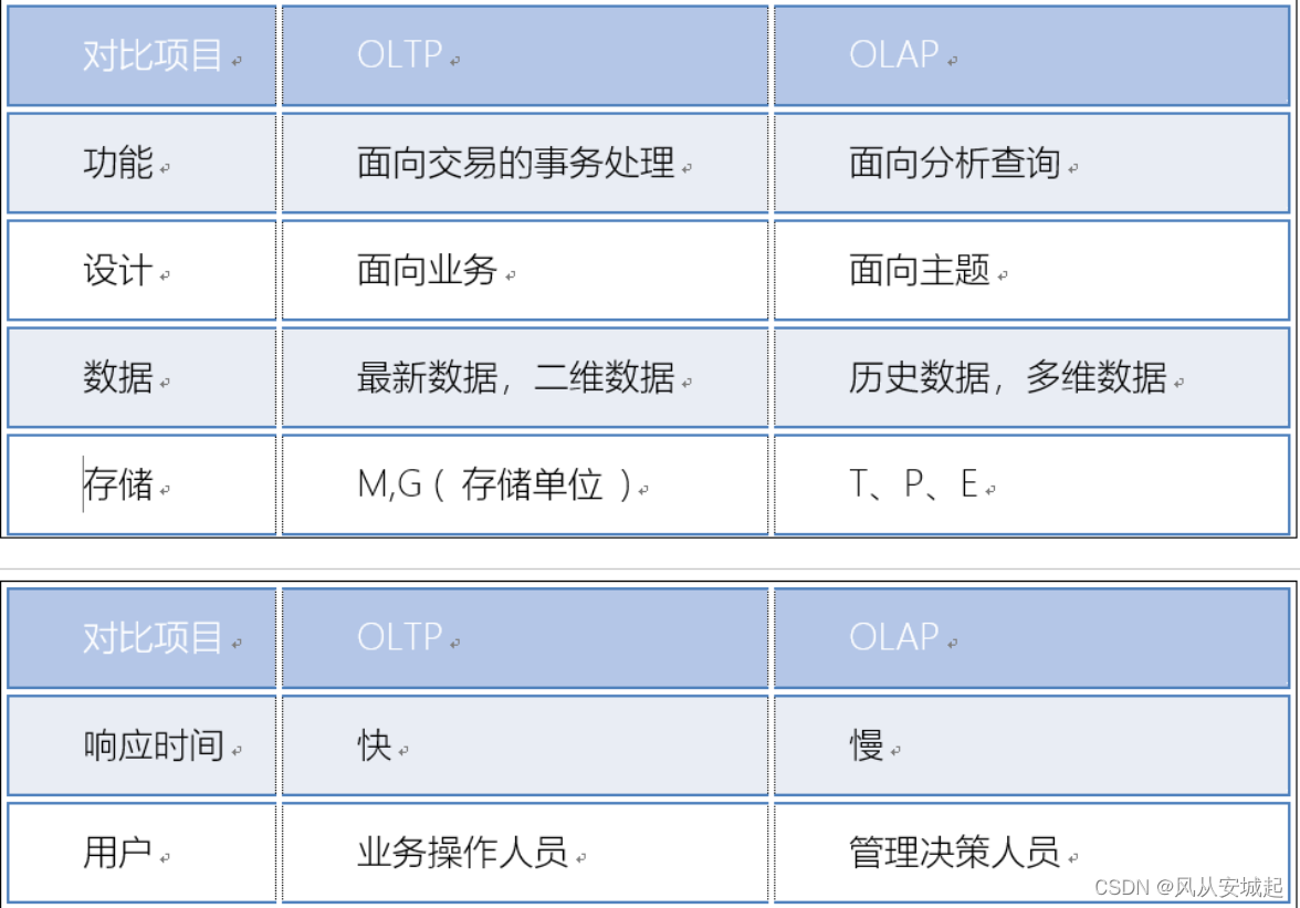数据仓库(OLAP): 面向于分析(主题)的 , 主要是用于分析数据, 主要是存储的过去历史数据 , 交互性较弱 可以允许出现一定的冗余