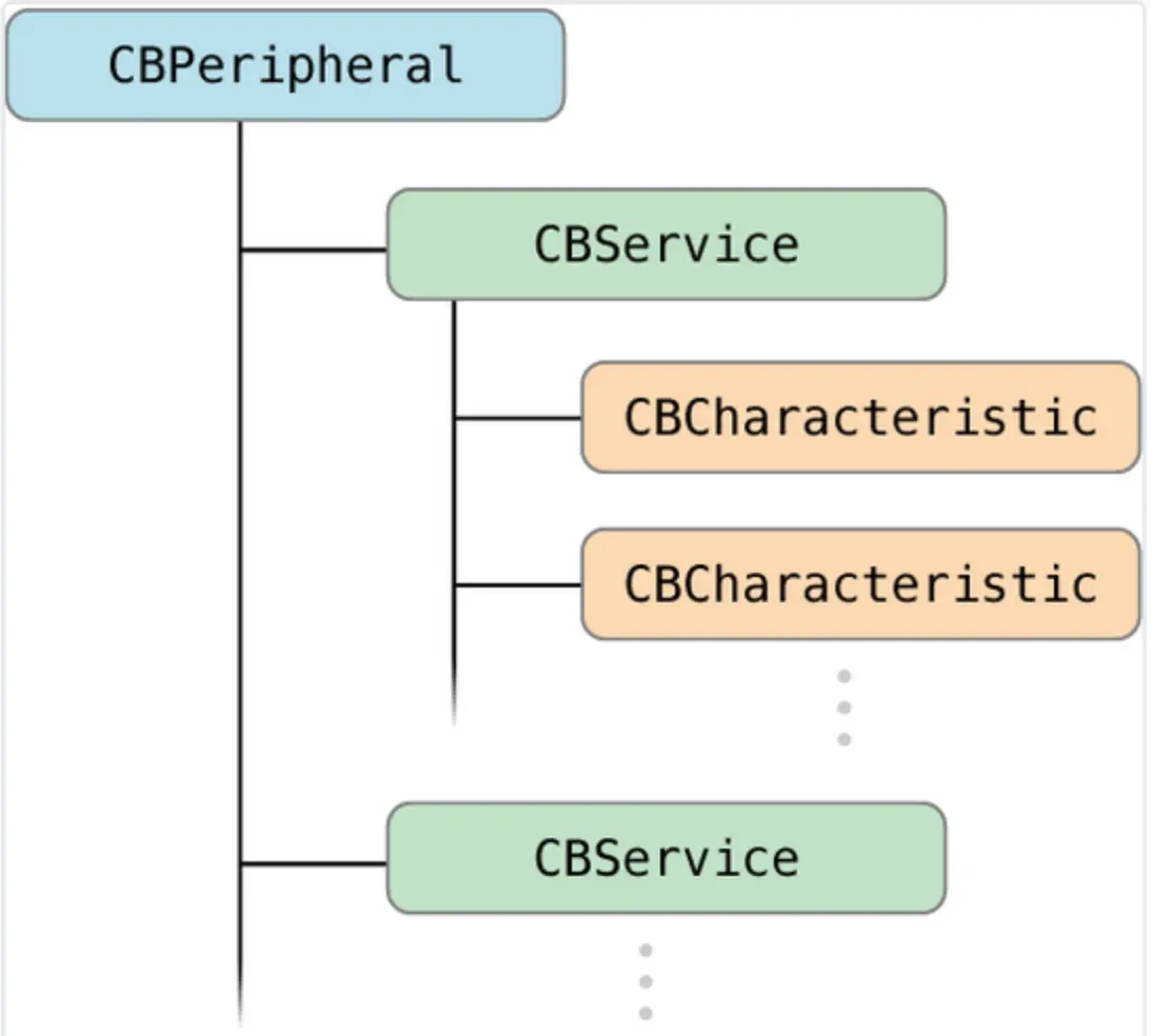 - peripheral,central:外设和中心设备,发起链接的是central(一般是指手机),被链接的设备是peripheral(运动手环),也可两个手机,一个座位外设一个作为中心设备