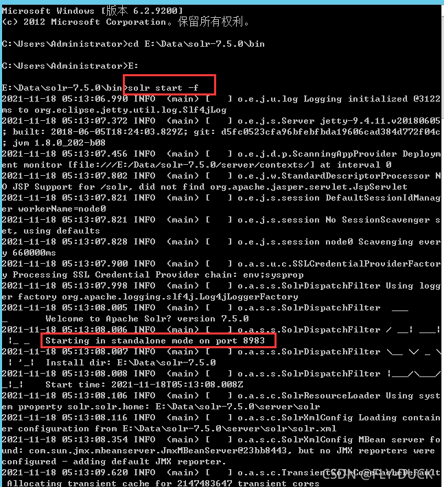 出现如下界面标识运行solr成功,默认的端口号为8983。