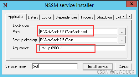 之后在nssm的图形化工具中Path参数选择solr.cmd文件作为,Argument参数设置为:start -p 8983 -f, 如图所示。然后点击Install service将solr安装为windows服务。