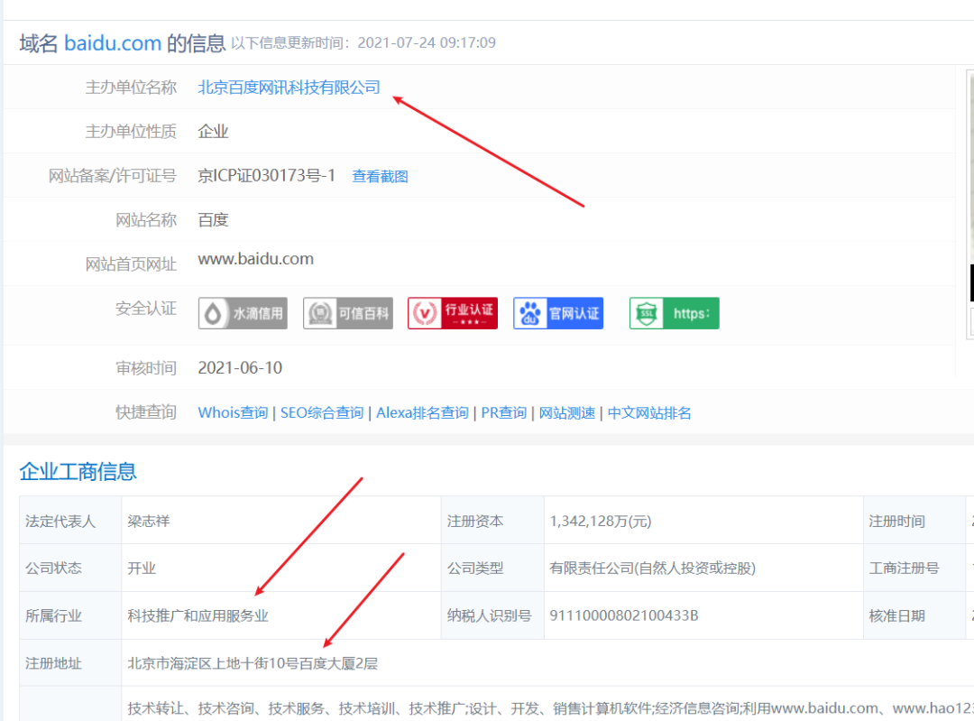 用站长工具(https://icp.chinaz.com/baidu.com)查一下域名的备案信息,找到公司名称。