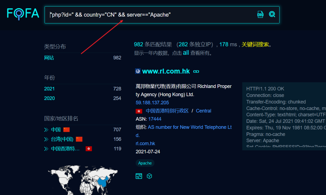 还可以继续加条件,比如 server=="Apache",这样Fofa就只会搜索使用Apache中间件的网站,功能强大到没朋友!