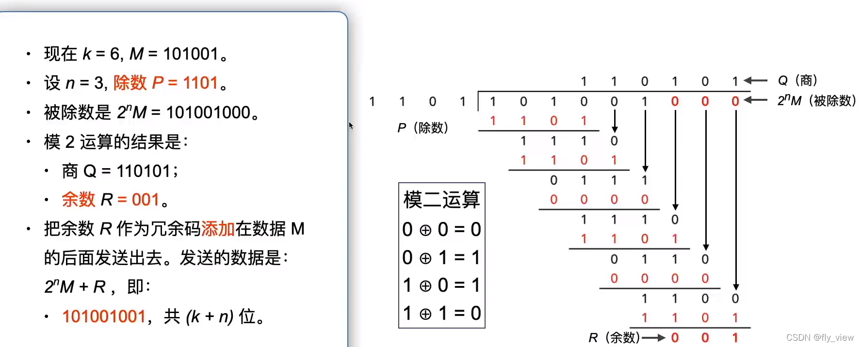 第三步,将余数R作为冗余码拼接在数据M的后面并发送出去。