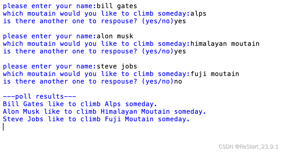 print(f"{name.title()} like to climb {favorite_moutain.title() someday.}")
