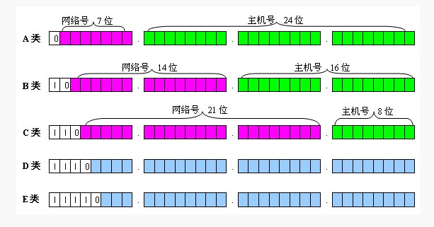 IP地址分为五类,A类保留给政府机构,B类分配给中等规模的公司,C类分配给任何需要的人,D类用于组播,E类用于实验,各类可容纳的地址数目不同。