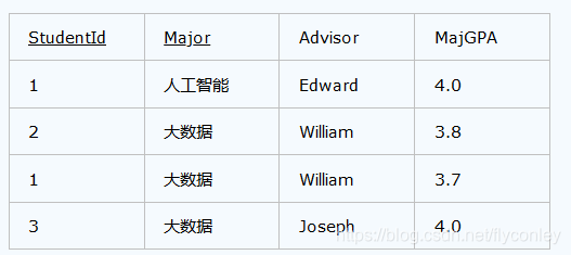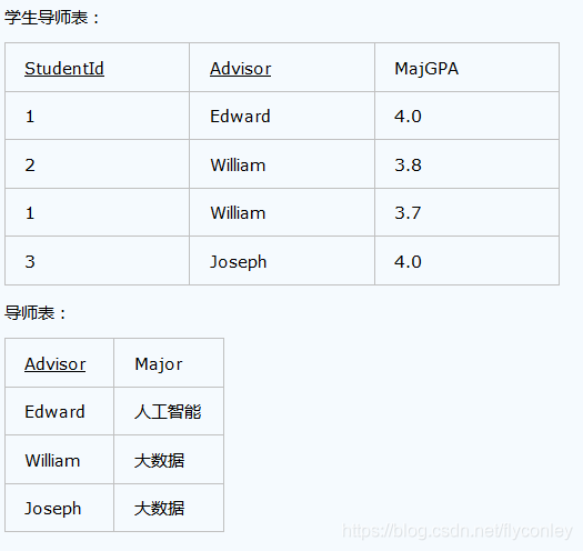 比如我们有一个学生导师表,其中包含字段:学生ID,专业,导师,专业GPA,这其中学生ID和专业是联合主键。
