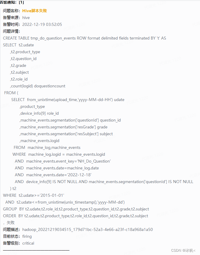 jAlert = jAlert + ">问题名称:**<font color=\"warning\">" + "Hive脚本失败" + "</font>**\n" \