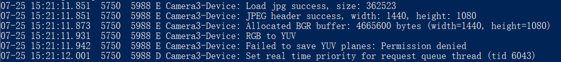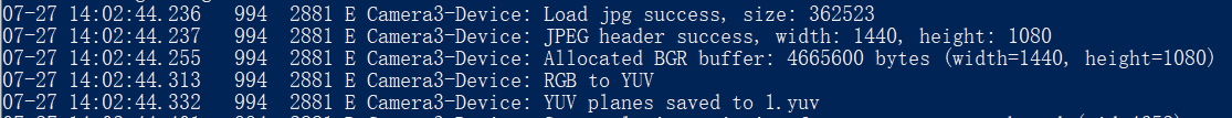 打开相机,看到如下日志,即说明YUV文件生成成功,大小为 4665600 字节
