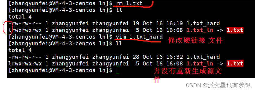 3、先将源文件删除,再修改硬链接文件,源文件并不会重新生成