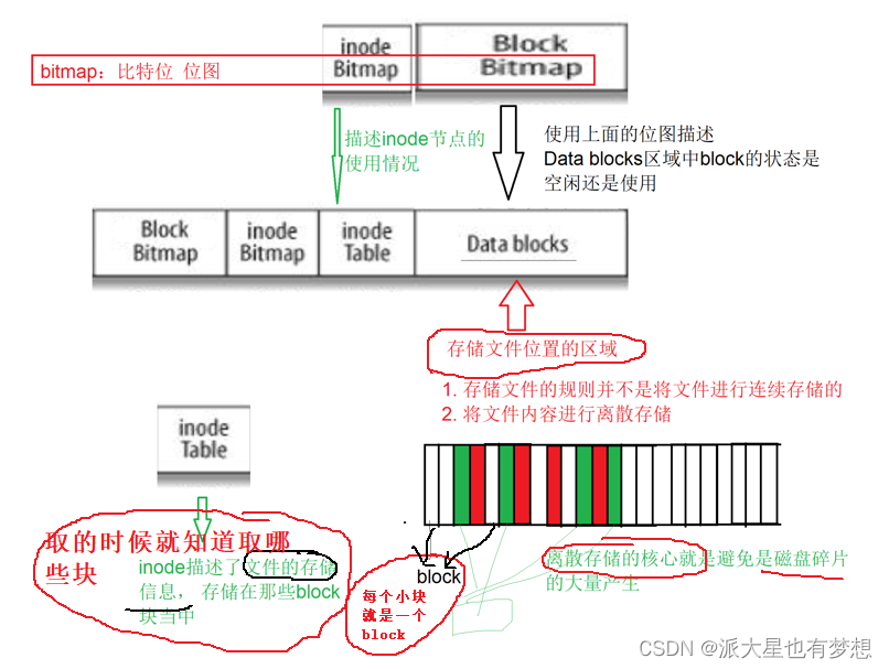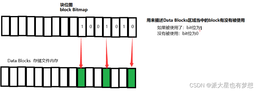 - Block Bitmap中记录着Data Block中哪个数据块已经被占用,哪个数据块没有被占用