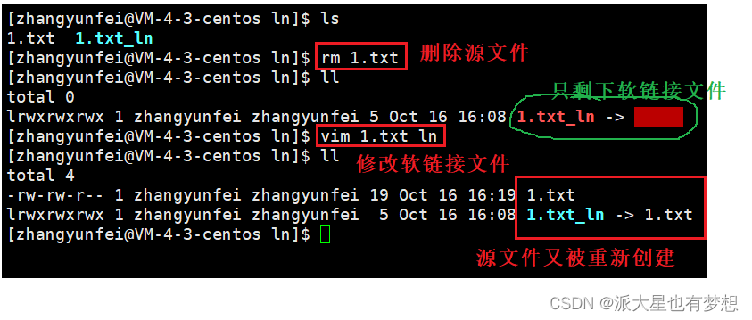 - 2.源文件如果被删除,软连接文件还在的话, 修改软连接文件,会重新建立源文件,源文件中的内容和修改的软连接内容一样,重新建立链接关系(这种要慎重)