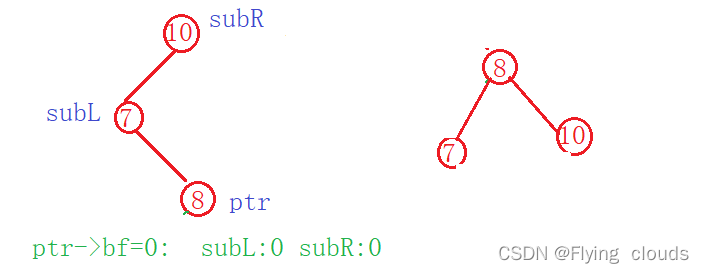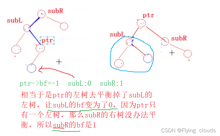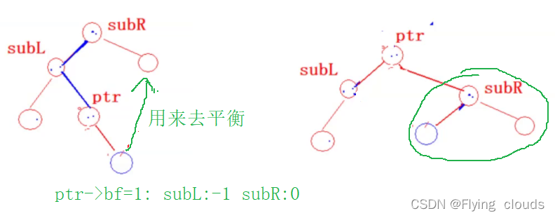 在先左后右调节平衡因子的时候比较复杂,因为subL,subR,ptr的平衡因子情况是都要进行改变的