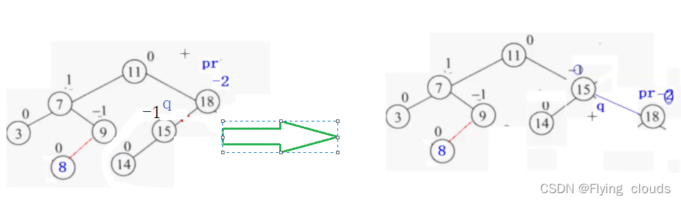 我们先让q指向pr较高的子树,再根据子树的bf进行分情况讨论