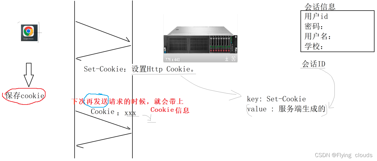 Cookie: 浏览器保存的信息,一般是客户端的一些不敏感的信息,Cookie数据的来源自服务端,