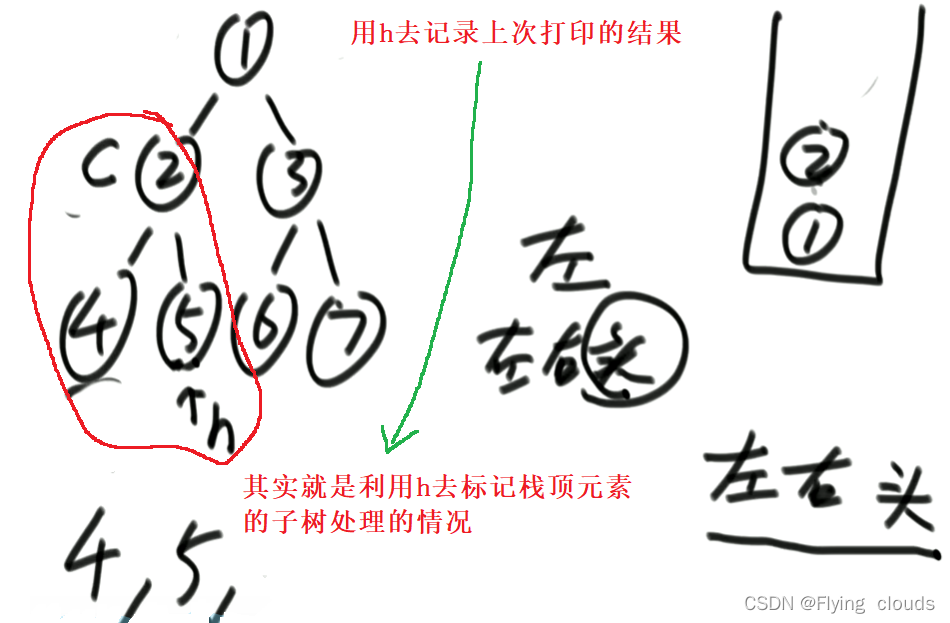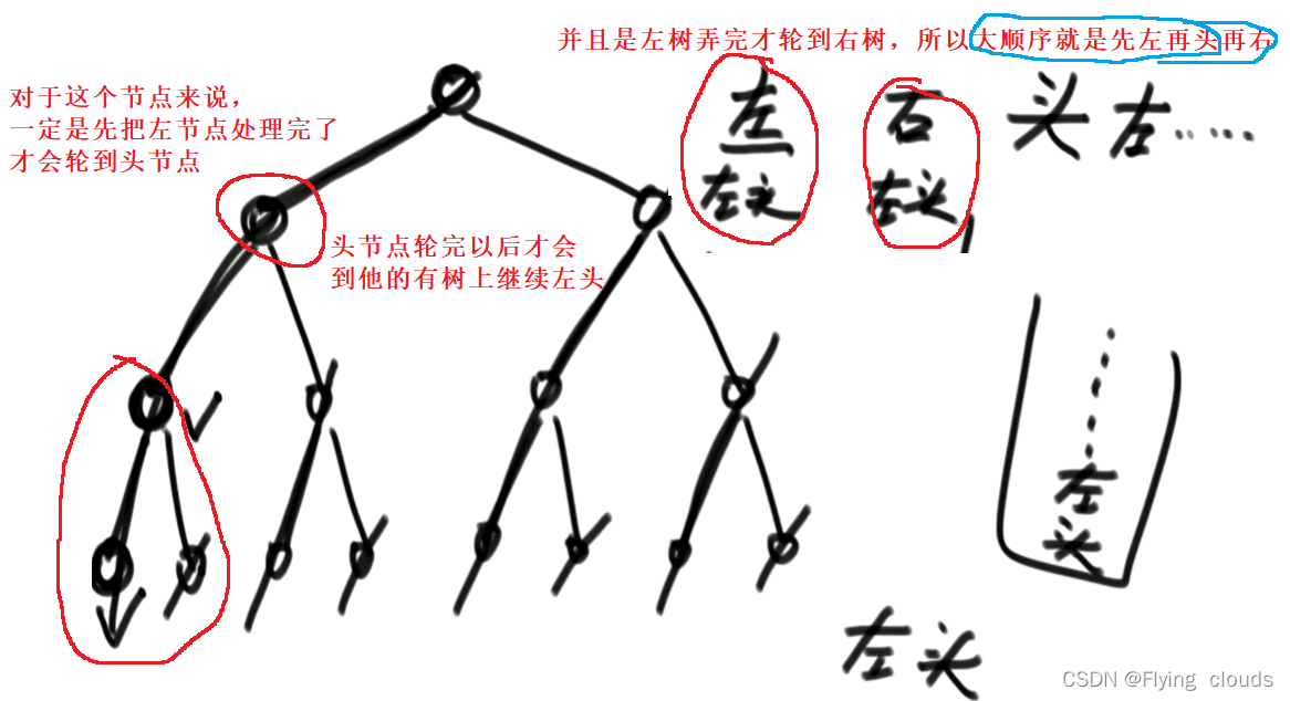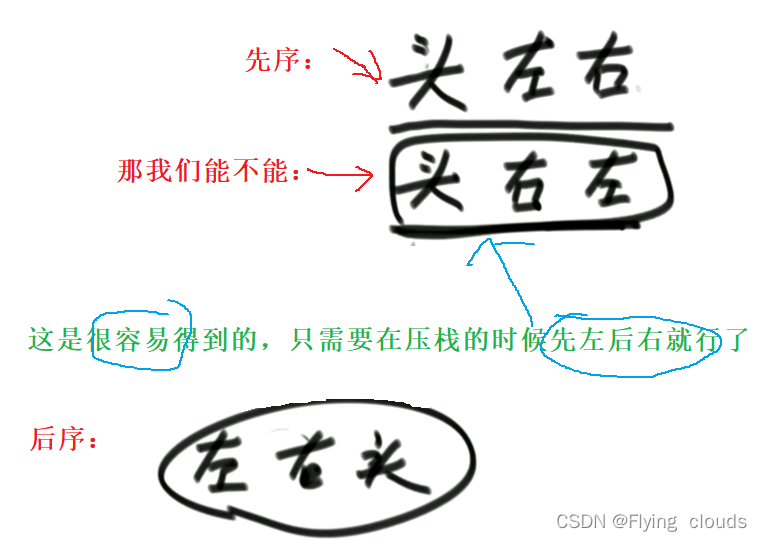 那么 头 右 左 的顺序是不是有点眼熟呢?没错,这不倒过来不就是后序遍历了吗。