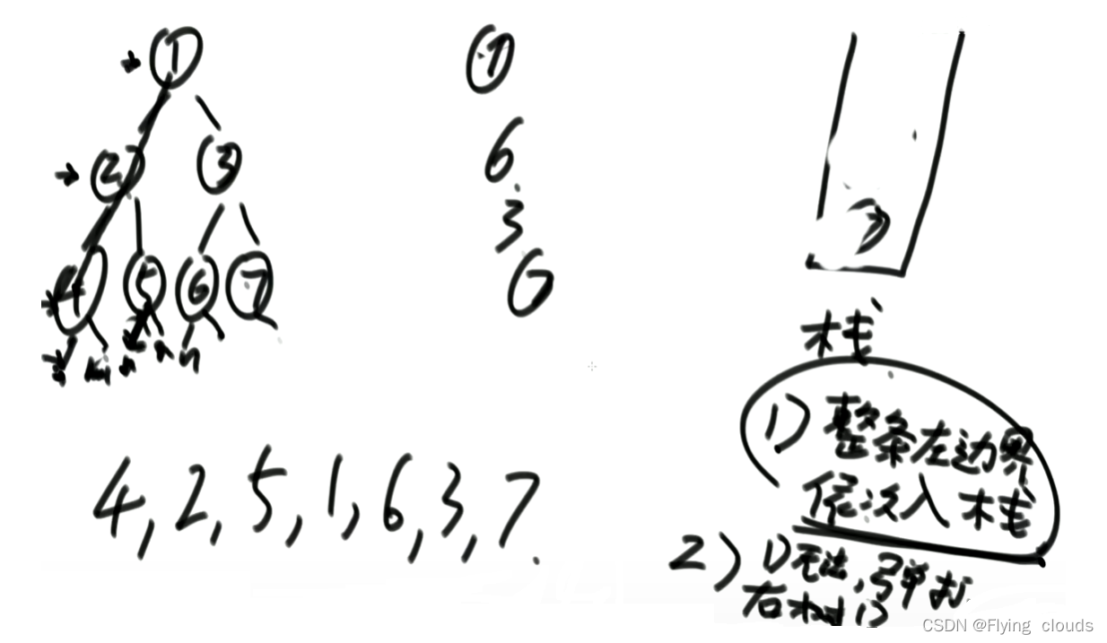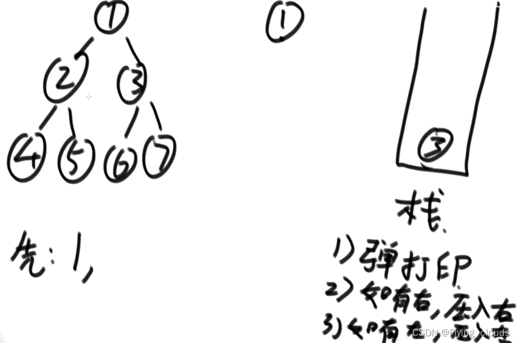 2. 1无法执行了,就弹出栈,并到弹出的右树上继续执行