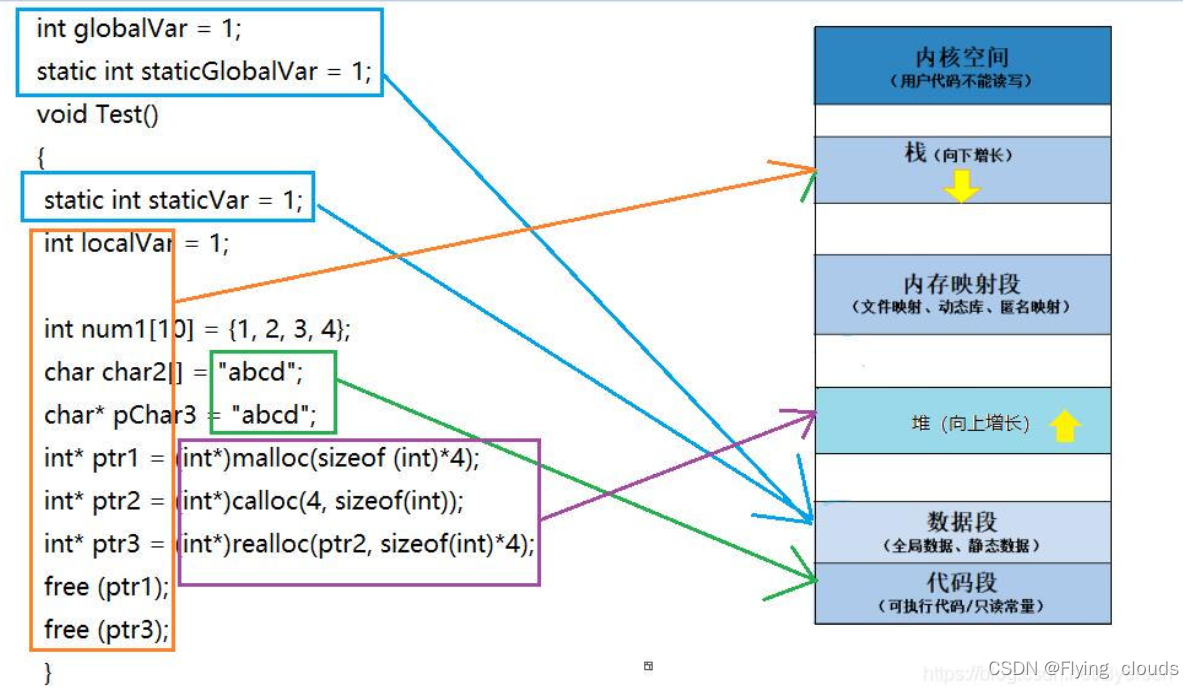 堆的生长空间向上,地址越来越大,栈则是向下,地址越来越小。栈的空间很小只有8M,而堆有4G。
