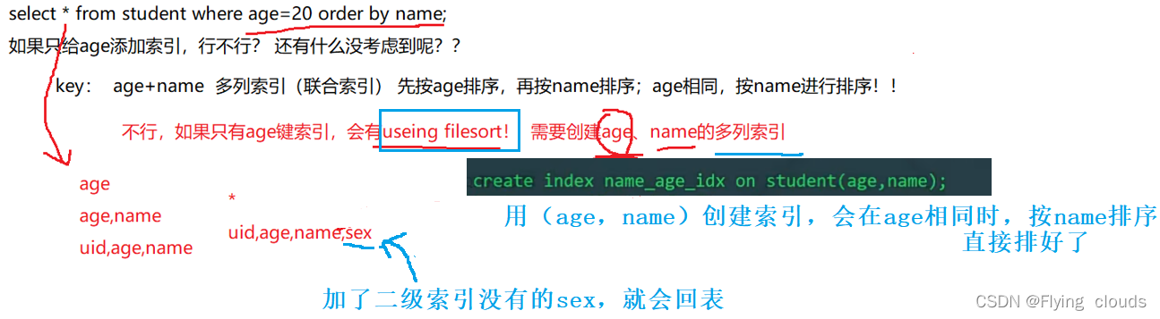 5、 一、可能会出现用了 where + order by,有using file sort的问题。为什么会出现file sort 外部排序的情况呢?因为数据都是在磁盘上存放的,如果没有加合适的索引,就只能先将数据读到内存当中,然后再进行排序的了,可以将where和order by 的数据进行一下联合索引,然后在进行。
