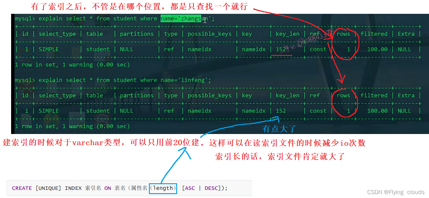 2、给字符串列创建索引的时候要考虑索引的长度,越短越好(只要能区分索引值就行)