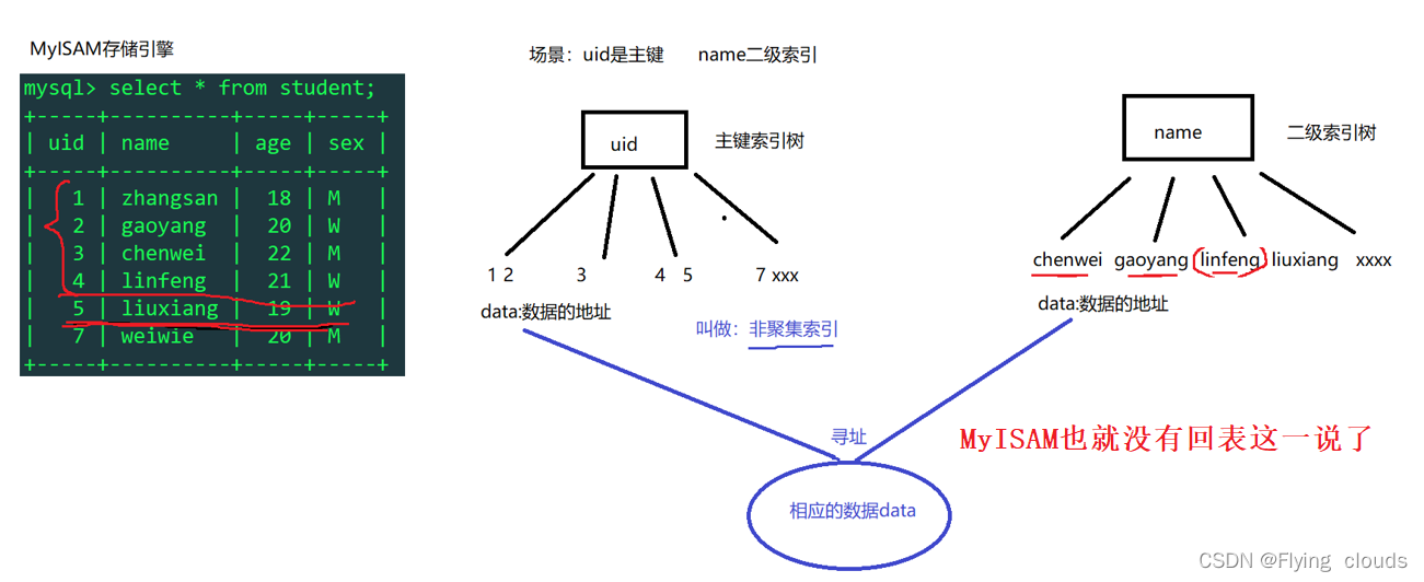 name 有索引:会有一个name.MYI的文件,从这个文件中会把数据加载到内存上构建一个b树,花费一次磁盘I/O读取到的数据就刚好写在b树的一个节点上面(最多磁盘I/O三次就行了),然后从根节点上开始字符串的比较,效率是log(n),因为MyIsAM的数据和索引存在不同的文件上,所以找到的data存放的只是真实数据的地址,还要到name.MYD上去拿数据