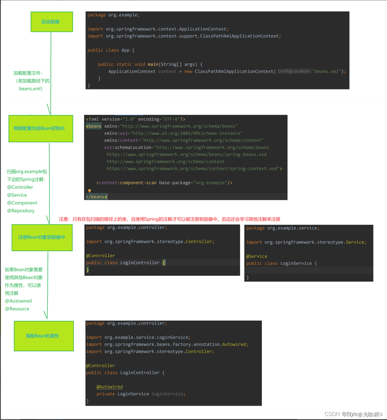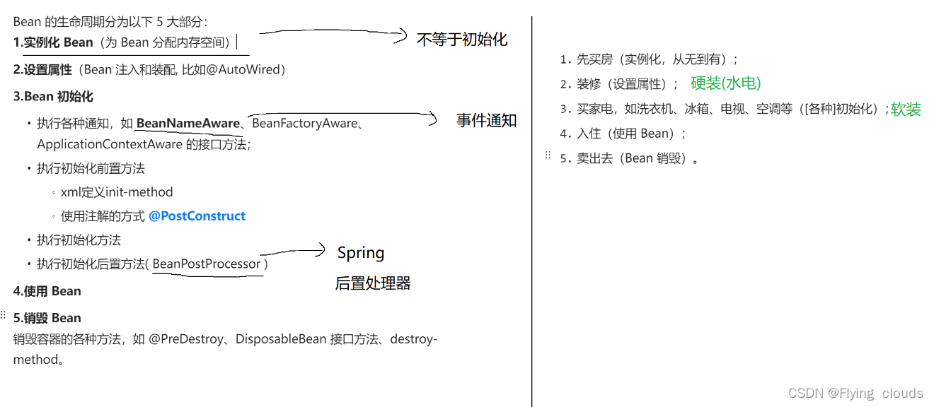 Bean 执行流程(Spring 执行流程):启动 Spring 容器 -> 实例化 Bean(分配内存空间,从无到