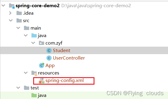 在创建好的项目中添加 Spring 配置文件 spring-config.xml,将此⽂件放到 resources 的根目录下