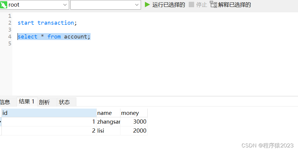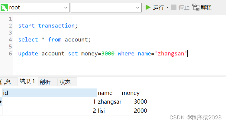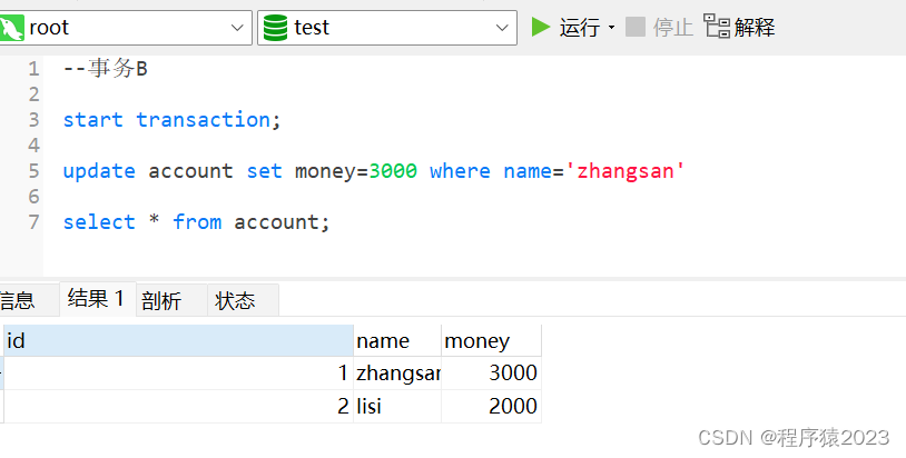 在事务B中将zhangsan的money修改为3000,不提交事务,在事务B中可以查询到zhangsan的money变成了3000; 但是在事务A中不会查询到未提交的数据,这就可以避免脏读。