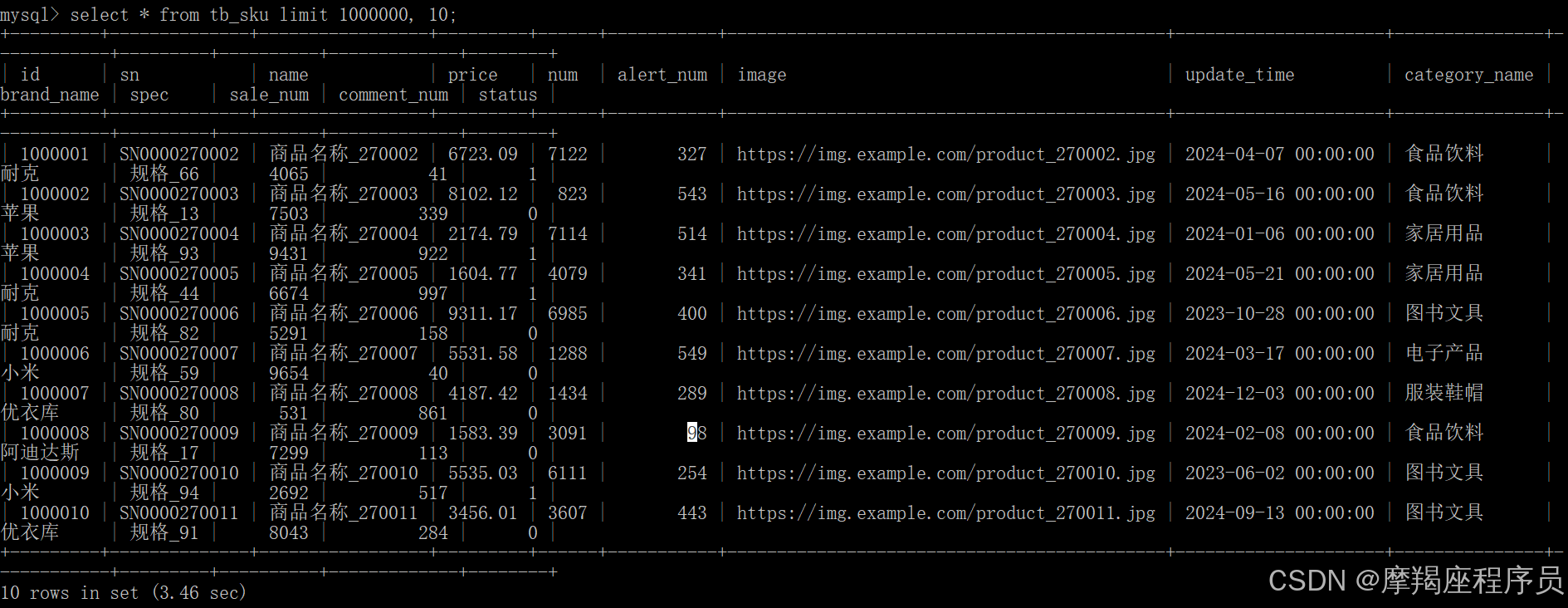 select s.* from tb_sku s, (select id from tb_sku order by id limit 9000000,10) a where s.id=a.id;