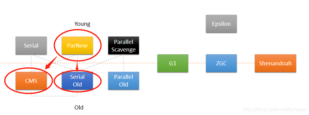 "ParNew"可以与老年代的垃圾收集器"CMS"或"Serial Old"搭配来完成垃圾分代收集的工作。但是不能与"Parallel Old"搭配进行分代GC。如下图所示: