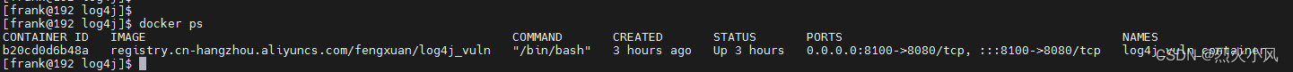 docker run -it -d -p 8100:8080 --name log4j_vuln_container registry.cn-hangzhou.aliyuncs.com/fengxuan/log4j_vuln