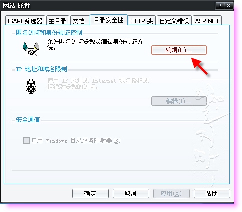 2.设置好虚拟路径后,浏览站点:http://localhost/myweb,出现http 500 内部服务器错误 The specified module could not be found 解决办法:打开IIS 信息服务----在左侧找到自己的计算机,点右键,选择属性-----主属性中选编辑,打开“目录安全性”选项卡,单击“匿名访问和验证控制”里的“编辑”按钮-----在弹出的对话框中确保只选中了“匿名访问”和“集成Windows验证”两项,并且且去掉“允许IIS控制密码” |